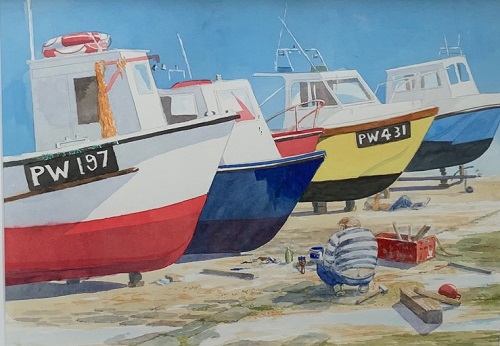 1. The Boatyard [Section Boats]: This encapsulates so much about coastal life in Cornwall and Devon, including for me and my brother (both usually reluctantly) helping my dad with boat maintenance. The colours are strikingly vibrant compared to most of Roger's work, which for me is an optimistic view of the longevity of the fishing boats out of Padstow. The builder's bum is obviously a piece of added mischief which I can hear Roger chuckling about as he paints it.