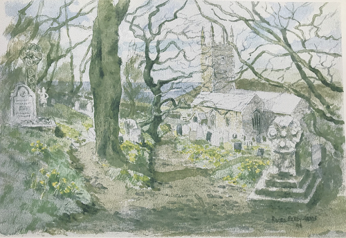 2. St Swithin's Church, Launcells [Section Churches]: You will see that St Swithin's has been frequently drawn and painted by Roger, with numerous perspectives. I particularly like this one because I think it draws out the ancient nature of the church with the almost haunting detail on the gravestones and Roger's gift of gnarled trees. Who doesn't like a potter around an ancient Cornish churchyard?: this one is wonderful.